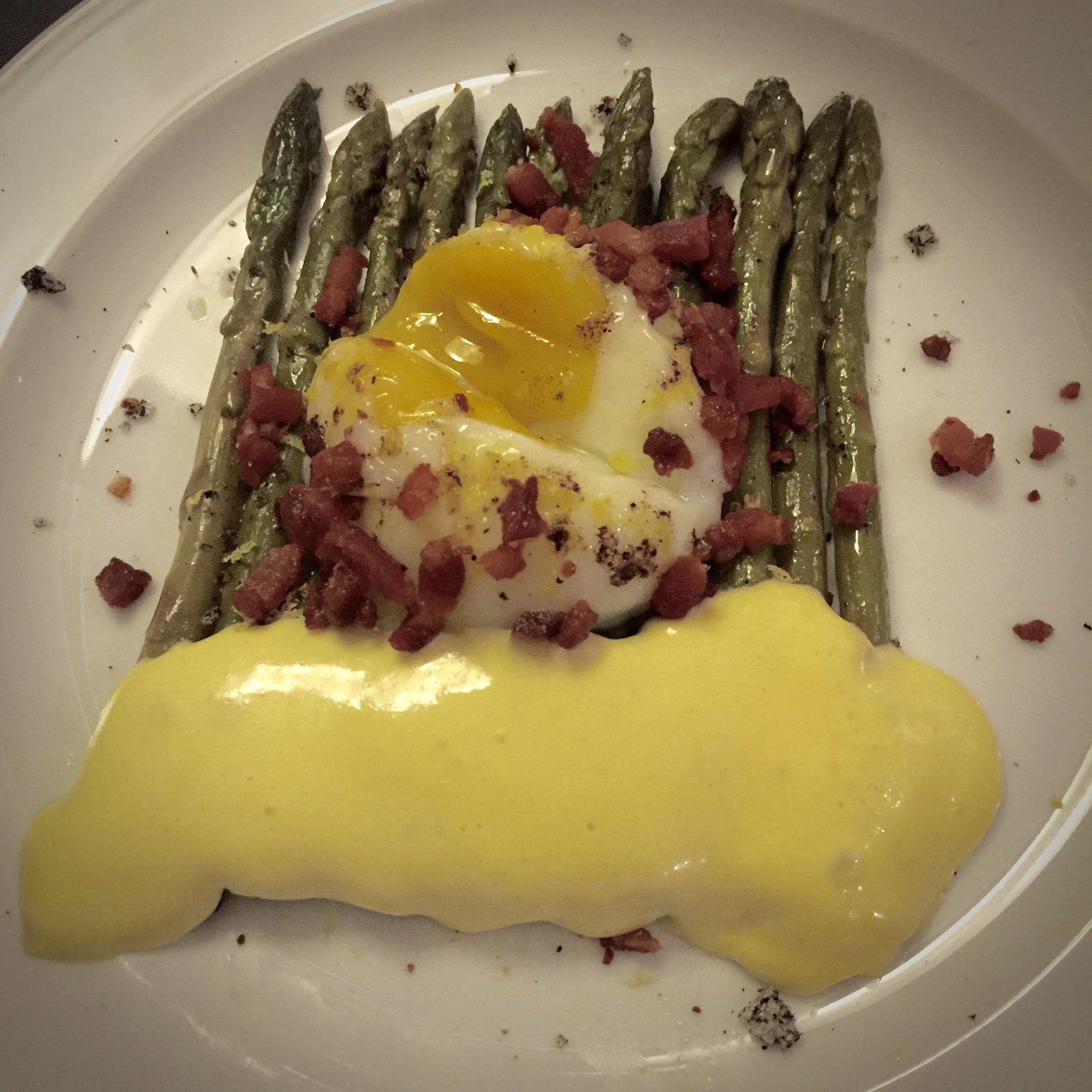 The main idea for the recipe comes from the Sous Vide Asparagus with Sous Vide Egg, Pancetta, and Hollandaise from the Sansaire site, but as we had some time on our hands we decided to try the Sous Vide Hollandaise foam from the Modernist Cuisine site as well.
