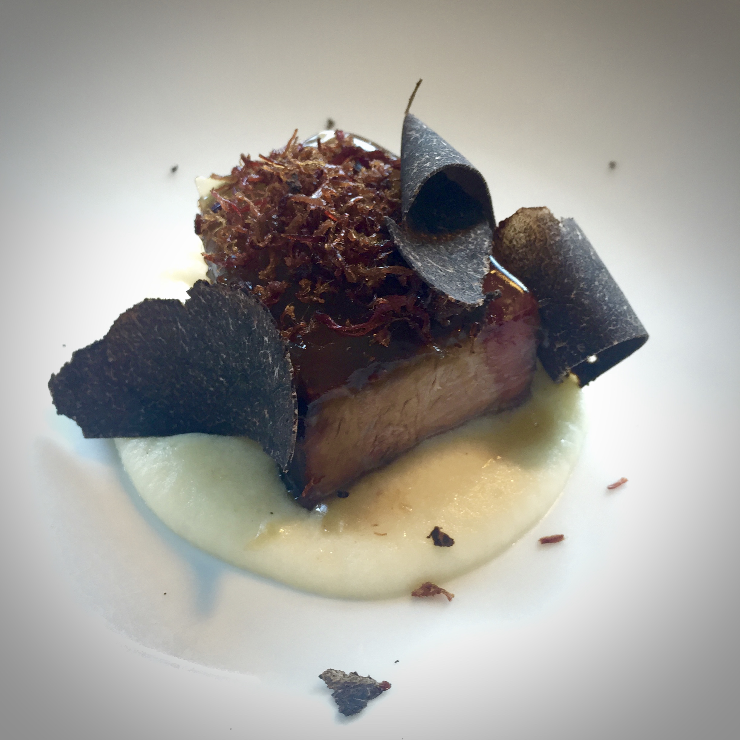 Sous vide cooked Flat Iron Steak / truffle / “hot lightning”; a Dutch potato stew with sweet apples, sour apples and onions