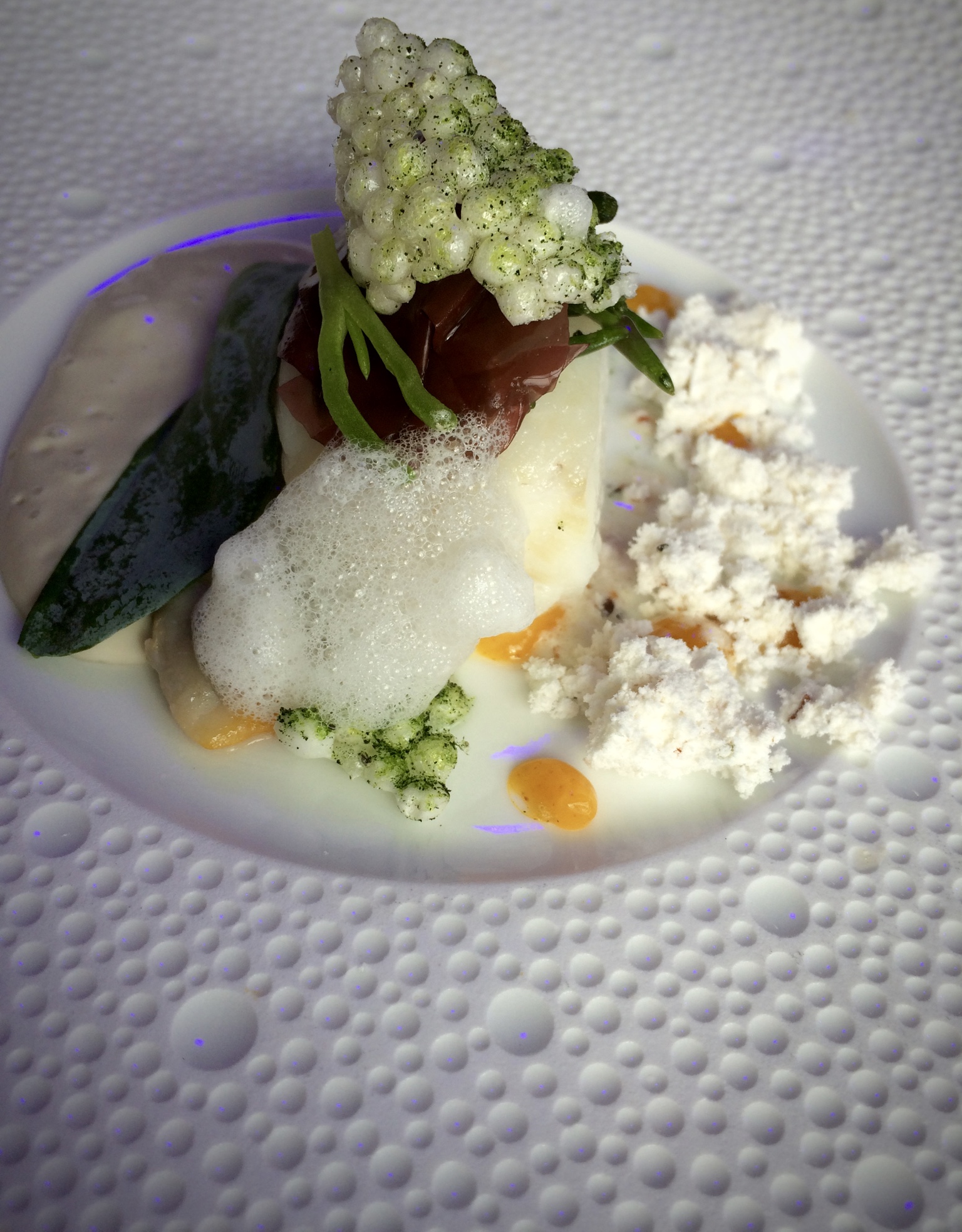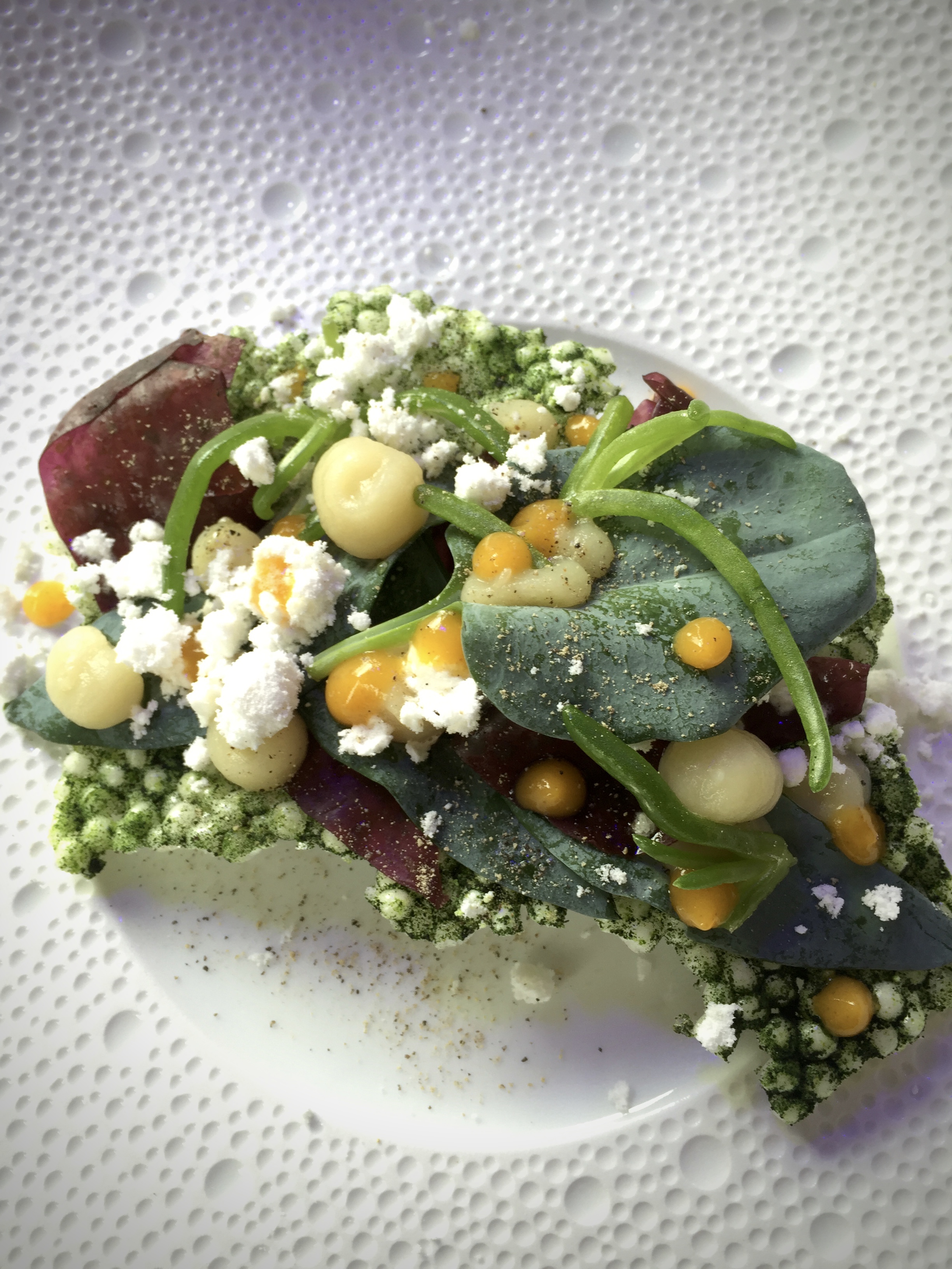 The purple hues on the picture are from the lights above the table that sometimes changed color to complement the dish being served. Details, details, details!