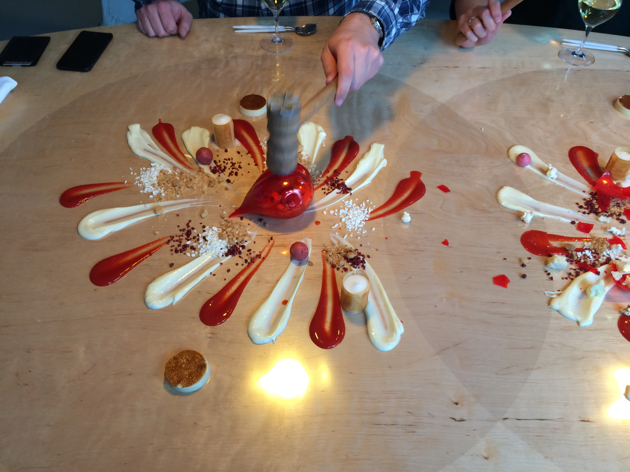 It was time for the dessert… The entire table was cleared and 2 huge rounds of plastic film were laid on the table. We got our cutlery and wineglass set directly in front of us. Soon after pretty much the entire kitchen team came out with 2 trolleys packed with all the components and started assembly right in front of us: A crème brûlée poured into a glass cylinder – and only set on the table – finished with a disc of burnt sugar, a tuile filled with a ginger beer mousse, a white chocolate bon-bon filled with Bloody Mary(!), various crumbles, popping candy and white chocolate yogurt and red fruit coulis “paints”. The centerpiece was an amazing sugar blown heart filled with popcorn, edible paper, and mini meringues. Now it was our time to wield the mallet….
