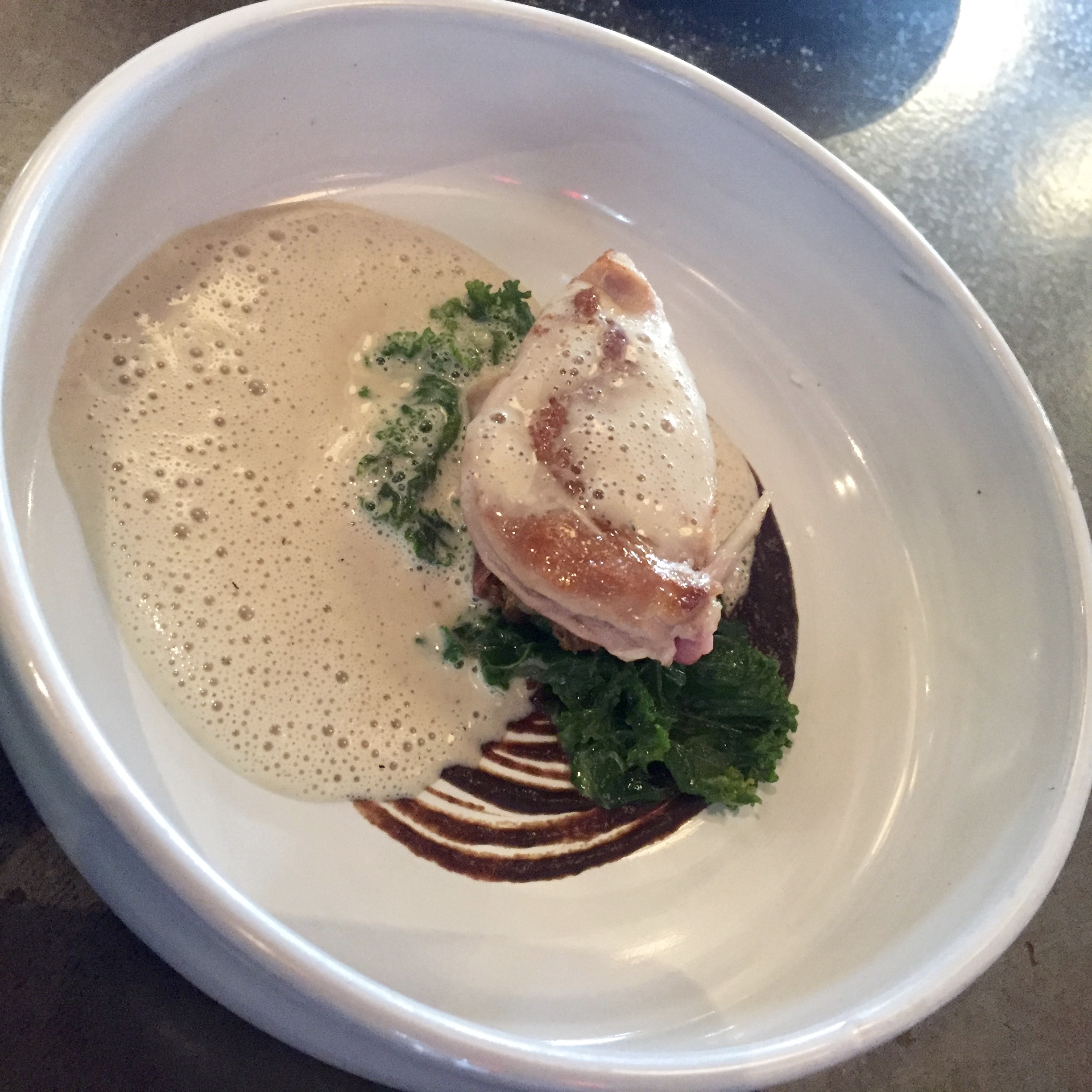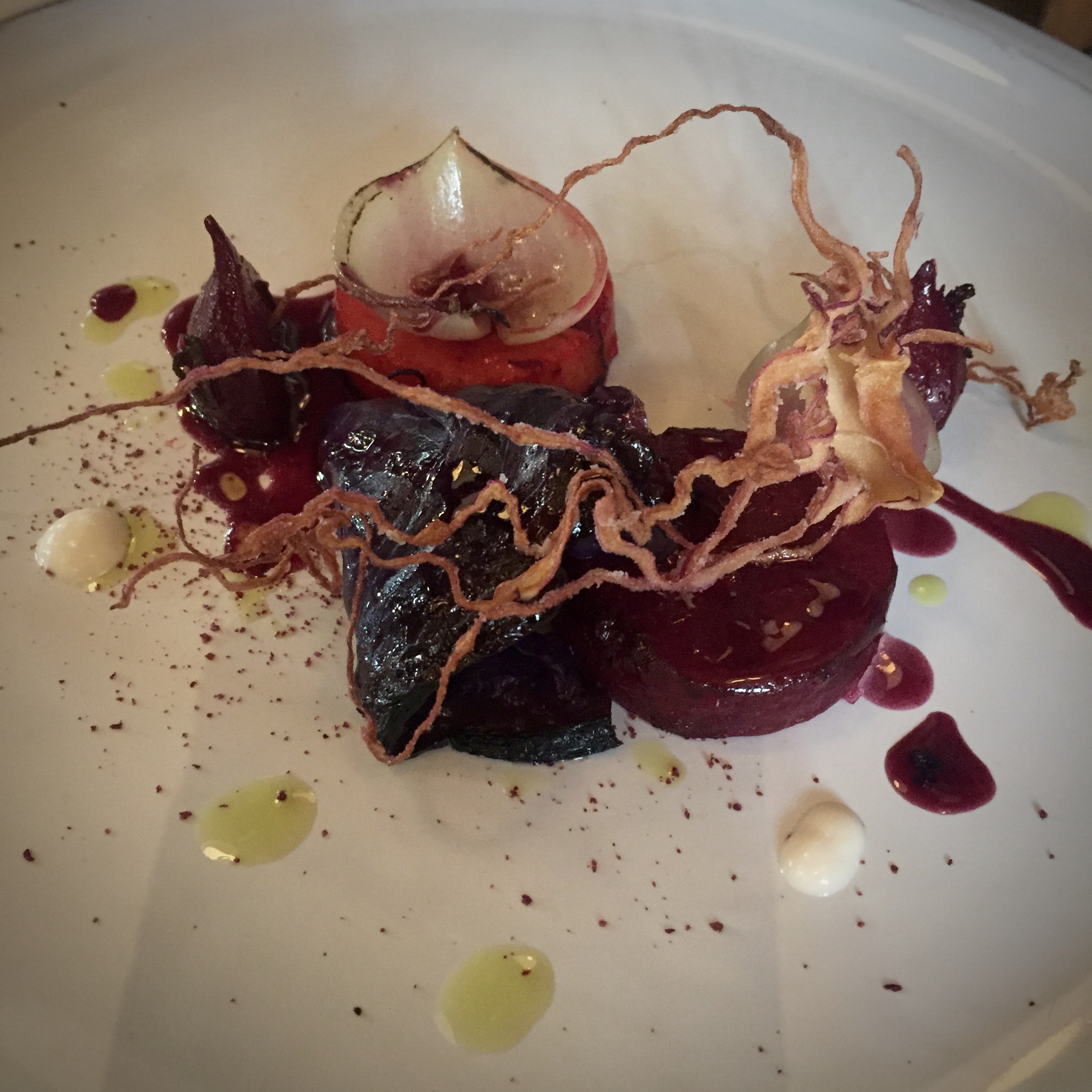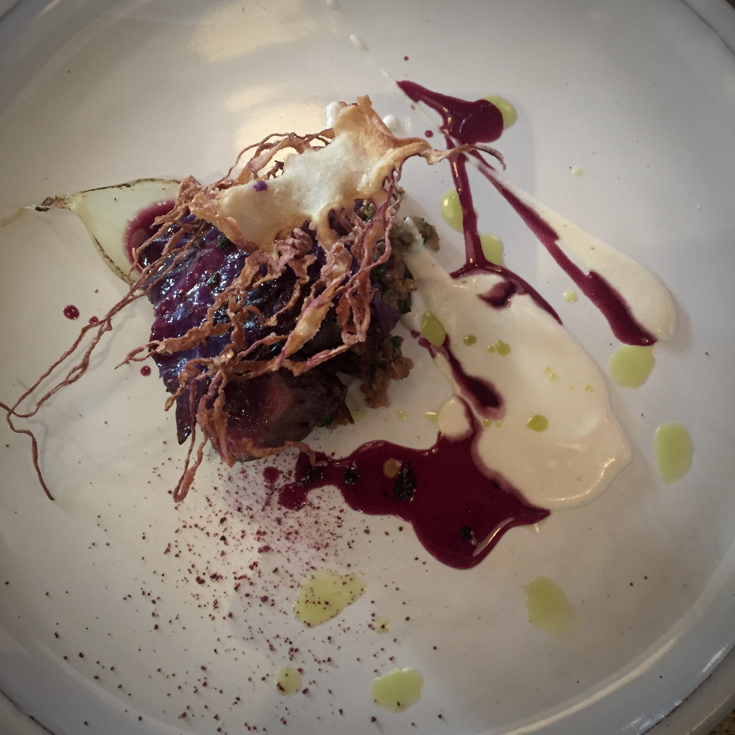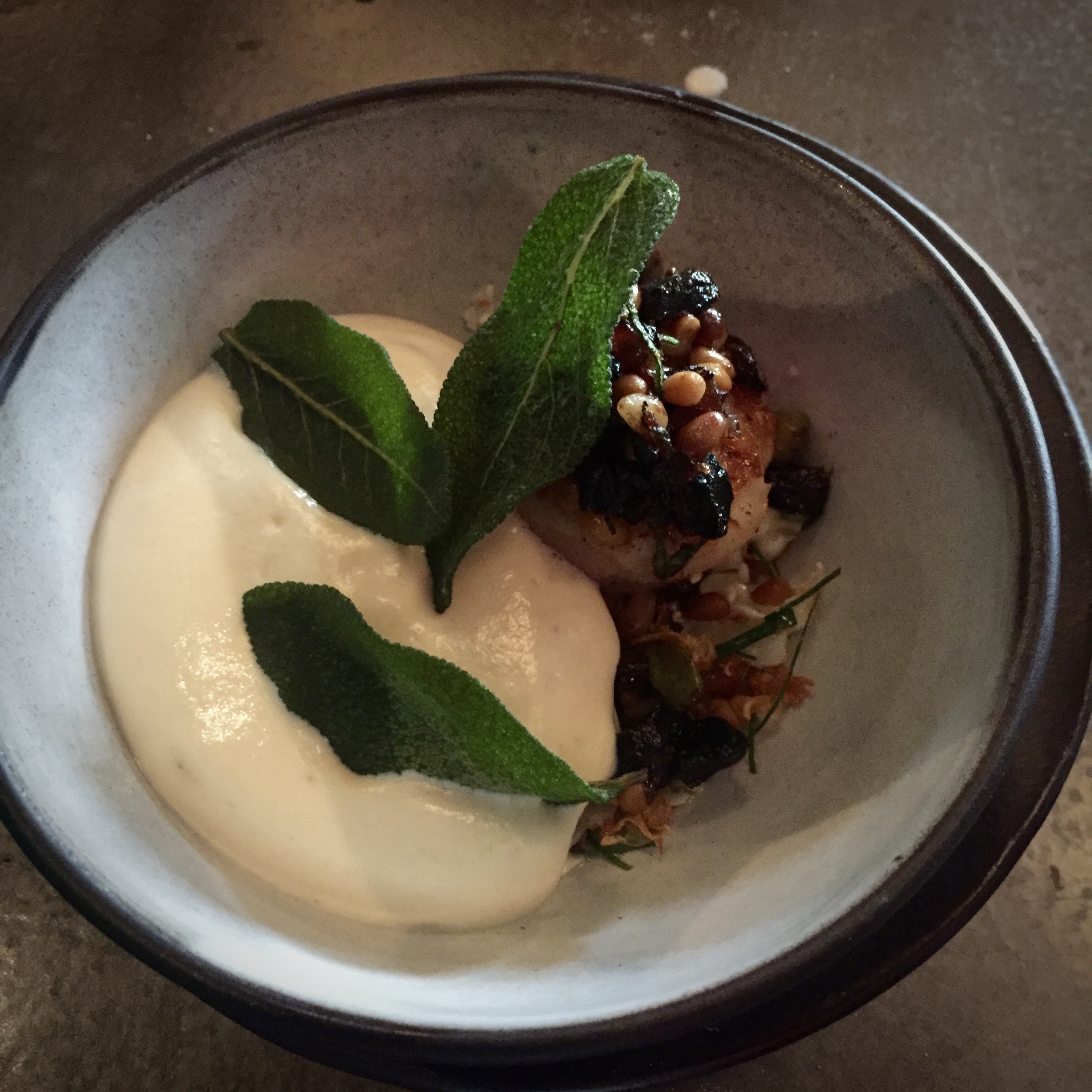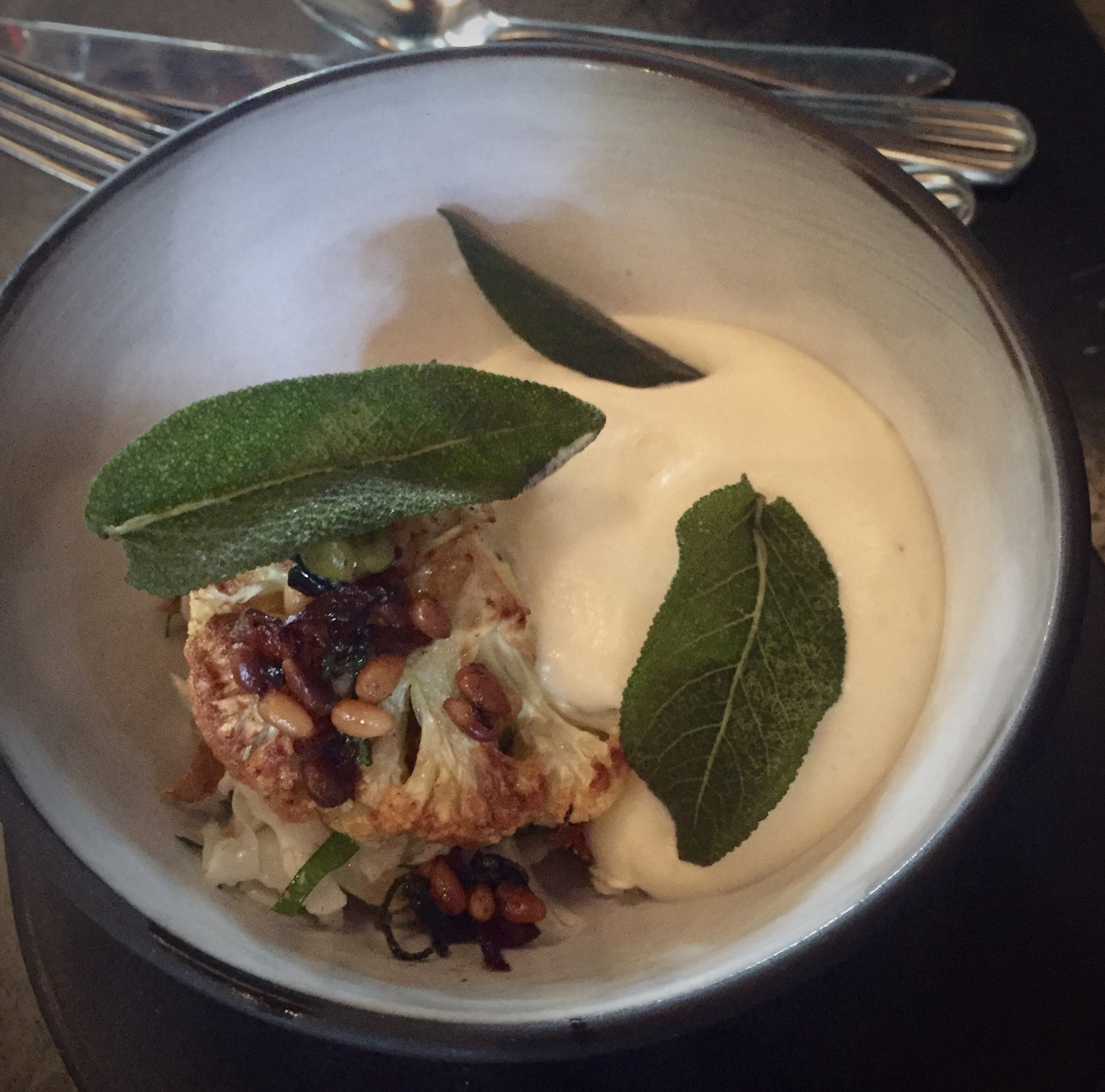 2b. “Cauliflower” Cauliflower salad, black garlic; caper & pine nut salsa, cauliflower cheese foam
