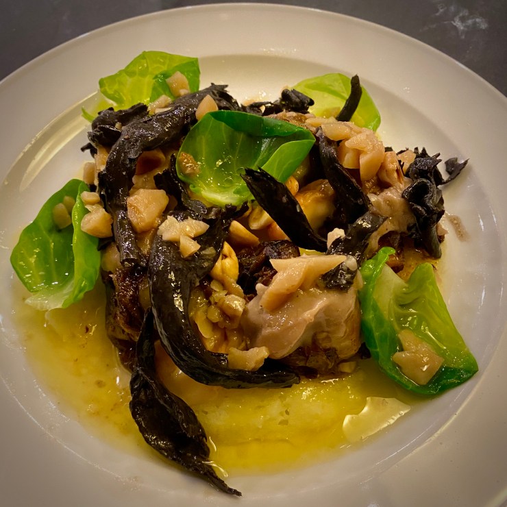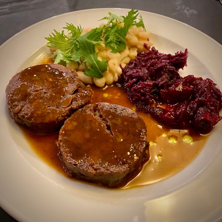 Wine pairings are available as well; usually a choice between 6 rotating wines by the bottle, or 4 of them in sets of 2 bottles, one red and white each. That week the sets were €27,50 and €32,50. I had selected the set that contained an uncommon 2019 Tempranillo Blanco by Nivarius (a white blend of 85% Tempranillo Blanco, 5% Viura, 5% Malvasía, and 5% Maturana Blanca from the Rioja region in Spain). The other bottle was a 2018 Barbera d’Alba (by La Ca’növa; Piemonte, Italy), which turned out to pair nicely with the both the Venison and Brussels Sprouts.